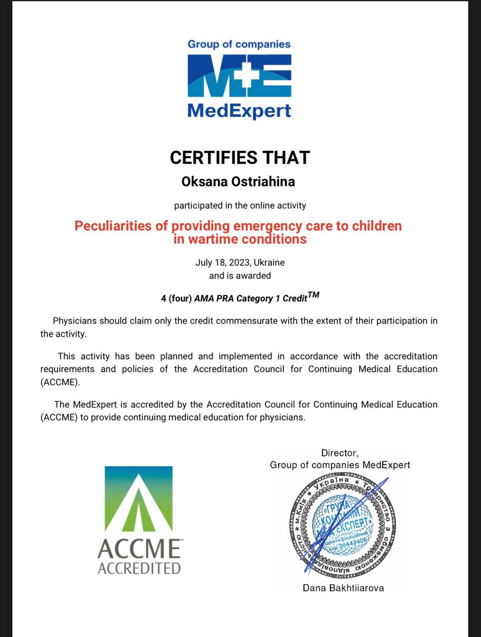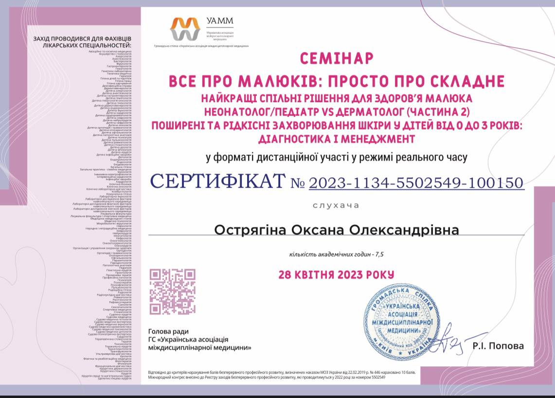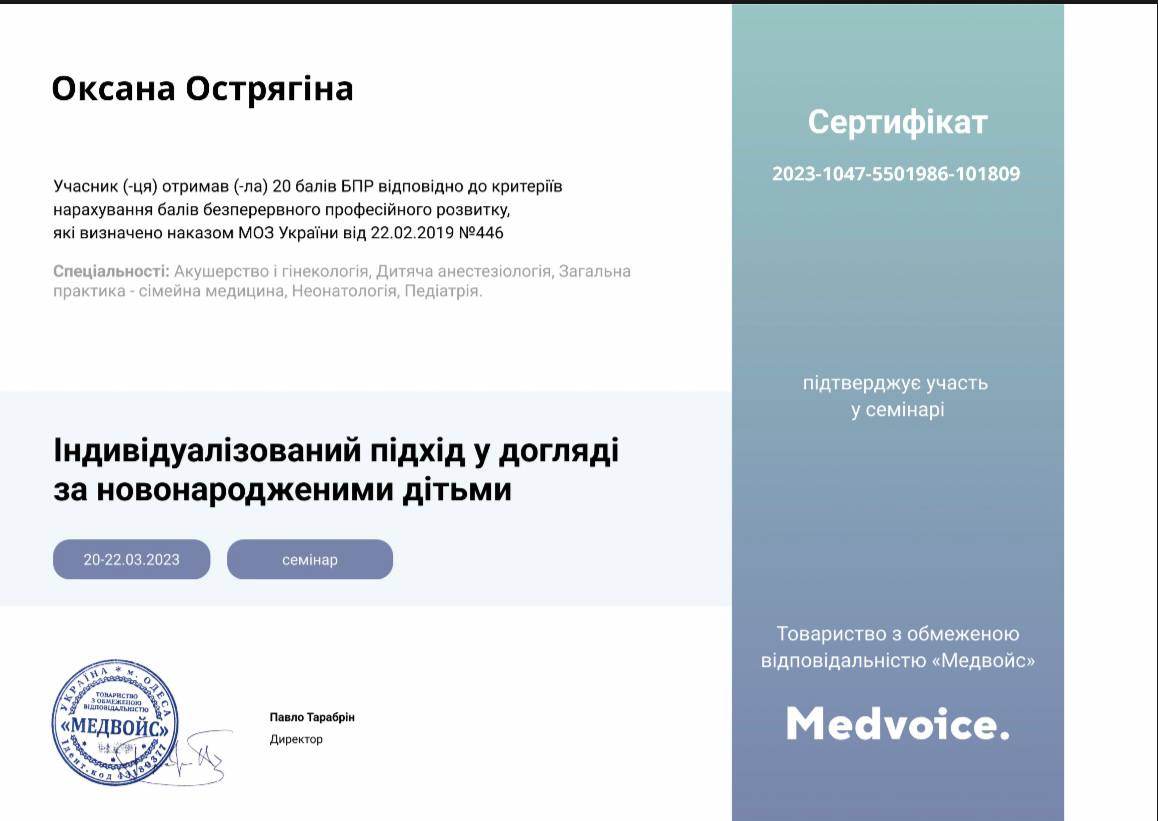 2023 — специализация «Педиатрия», Запорожский государственный медико-фармацевтический университет.