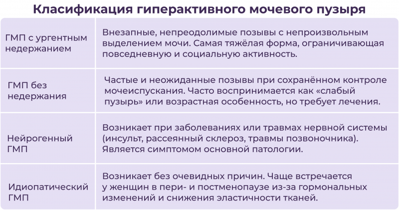 Гиперактивный мочевой пузырь может иметь разные формы, в зависимости от наличия сопутствующих симптомов и причин возникновения. В клинической практике выделяют несколько типов, которые важно различать при постановке диагноза и выборе тактики лечения: