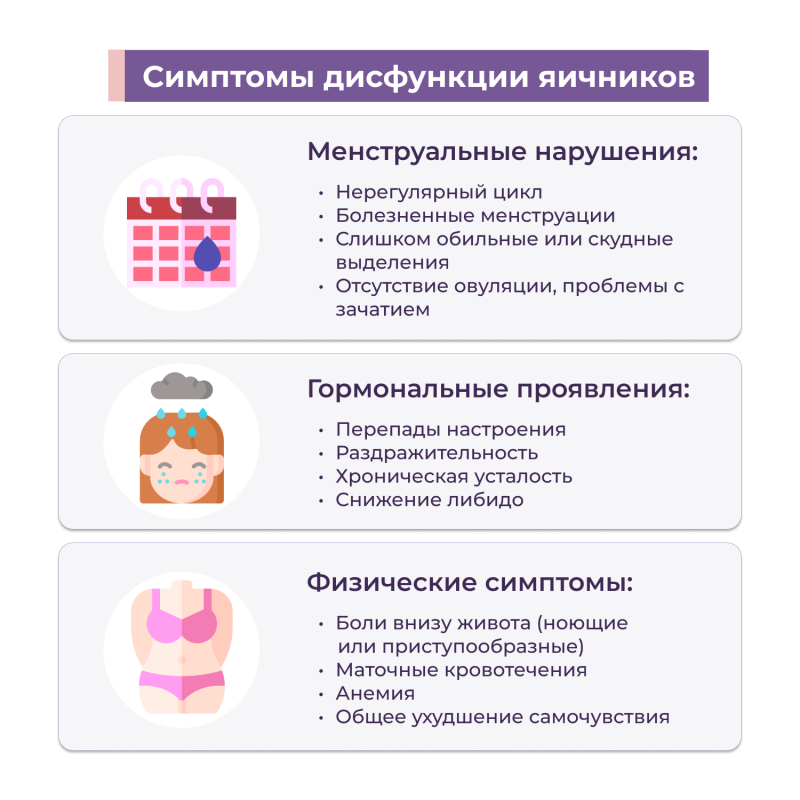 Гормональный дисбаланс может вызывать резкие перепады настроения, раздражительность, хроническую усталость и снижение либидо. Кроме того, женщины часто жалуются на боли внизу живота, которые могут быть ноющими или приступообразными. В тяжёлых случаях дисфункция яичников может приводить к маточным кровотечениям, анемии и ухудшению общего самочувствия.