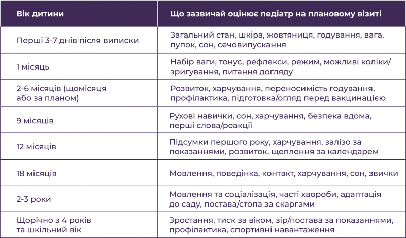 Нижче – орієнтир, який педіатр може адаптувати. Якщо дитина хворіє часто або є фонові діагнози, оглядів може бути більшим, і це нормально.