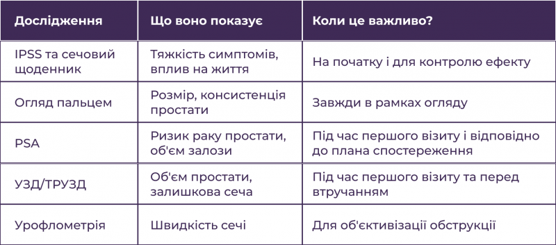 Існують й інші підходи — залежно від об’єму залози, тяжкості обструкції та типу переважаючих симптомів. Але в повсякденній практиці етап важливий настільки, наскільки він визначає тактику: спостерігати, лікувати таблетками або розглядати можливість втручання.